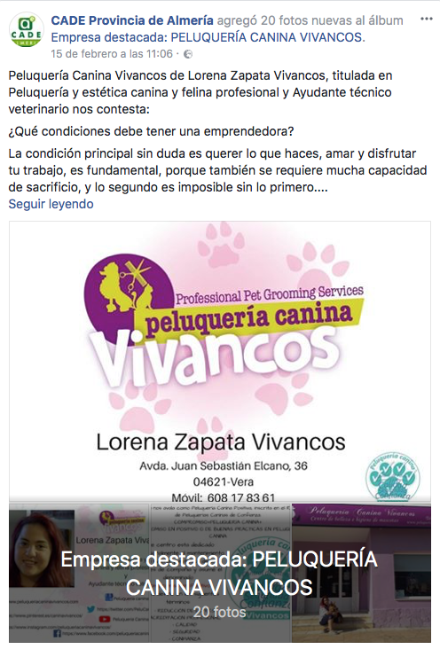 El Centro Andaluz de Emprendedores CADE de la Provincia de Almería ha destacado a nuestra empresa como referencia de joven emprendimiento con todos los requisitos de legalidad y calidad. Destacando la innovación de nuestra empresa como único Centro dedicado exclusivamente a la belleza e higiene animal que presta todos sus servicios con absoluta transparencia.