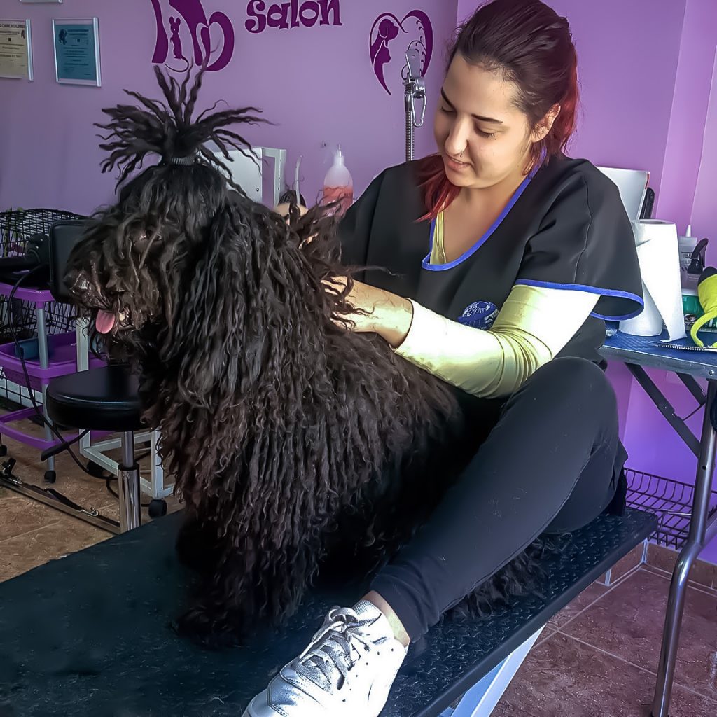 Hoy tuve un cliente muy especial. Brinco, de la raza húngara Puli, un primo lejano del perro de aguas español. Vino para comenzar el arreglo de sus cordones. En la primera sesión y siempre, hay que procurar que el perro se sienta tranquilo y confiado, ya que son muchas horas las que vamos a estar juntos.